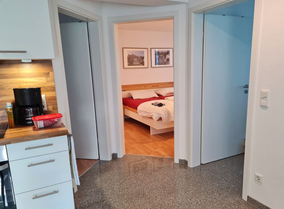 Türen zum Bad, Schlafzimmer mit Tür auf den Balkon und ins „Kinderzimmer“ mit Tür zum Balkon.