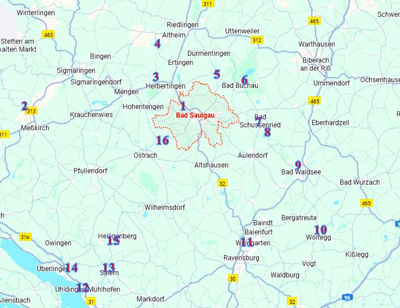 Alle Sehenswürdigkeiten sind in einem Umkreis von maximal etwa 50km um Bad Saulgau angesiedelt und können per Tagestouren bequem mit dem Auto erreicht werden.