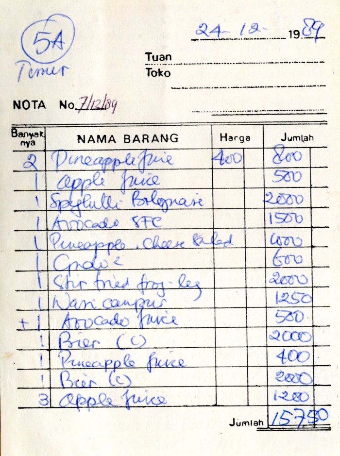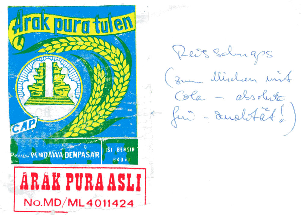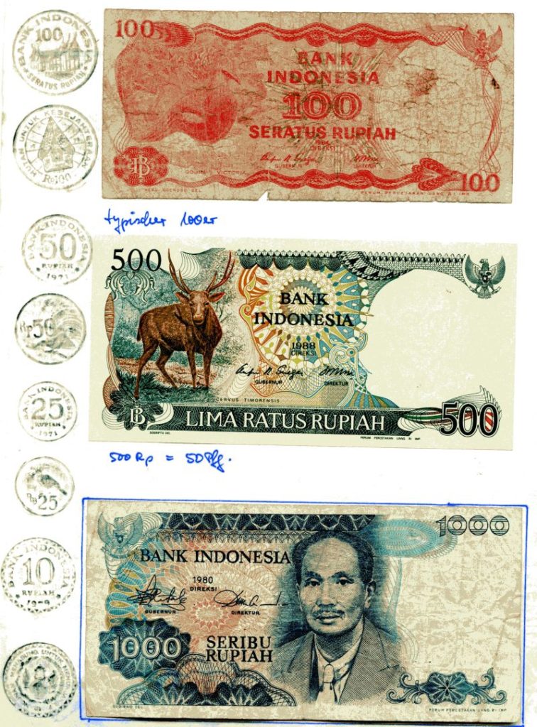 Wir leben uns ins lokale Preisniveau der Hauptstadt ein (was auf dem Land noch günstiger werden sollte): Nasi goreng – 1,25 DM, Mie goreng – 0,75 DM, 0,4 L Tee – 0,30 DM, 1 Bier – 2 DM. Für ein Bier kann man 2-4x essen. Ein Nasi goreng wird später 50 Pfg kosten. Wir haben einen einfachen Umrechnungskurs: 1 DM = 1000 Indonesische Rupies.