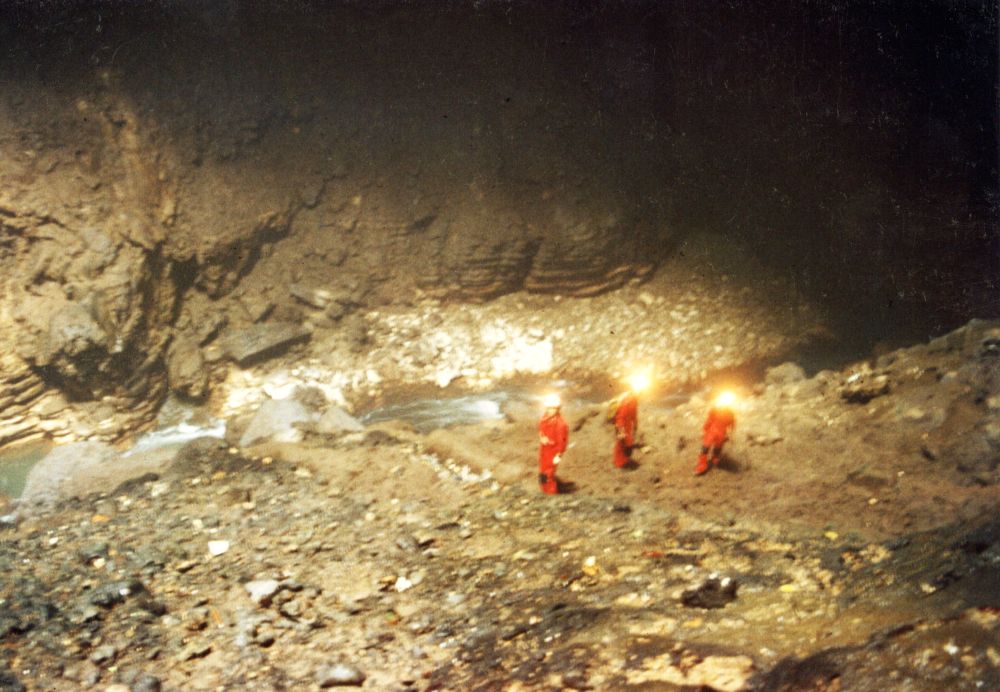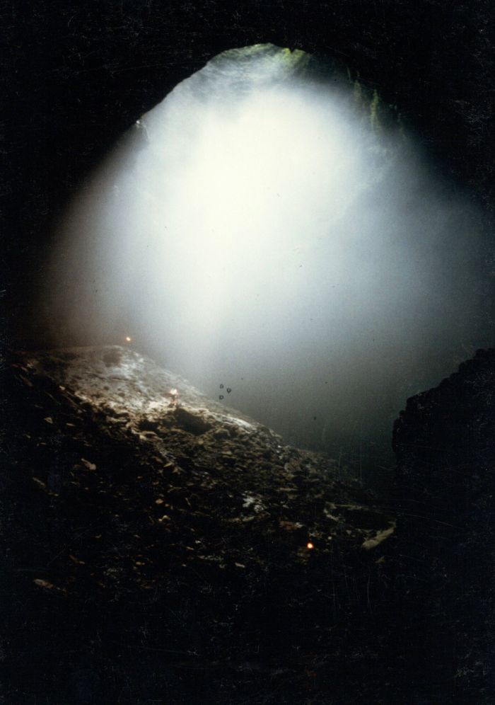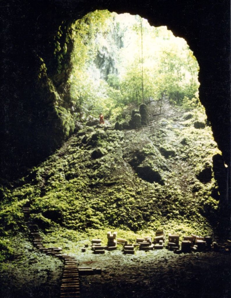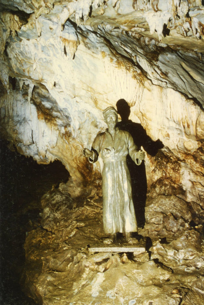 Diese war schon benutzt und ist mit vielen Einbauten und Inschriften versehen. Eine Schrecksekunde bescheren die plötzlich im Taschenlampenkegel auftauchenden lebensgroßen Figuren, die an Personen erinnern, die in der Höhle während Unruhen überleben konnten.