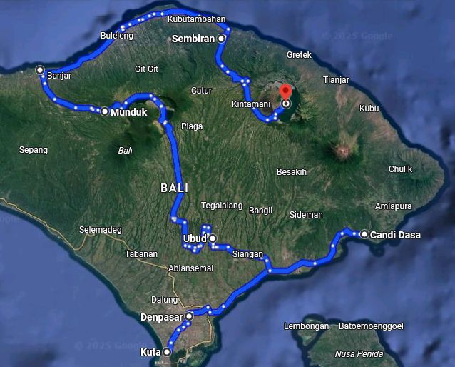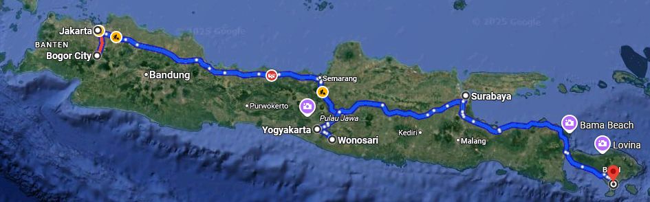 Das sind rund 1500 km mit öffentlichen Verkehrsmitteln von Jakarta über Jogyakarta und Surabaya nach Denpasar auf Bali.