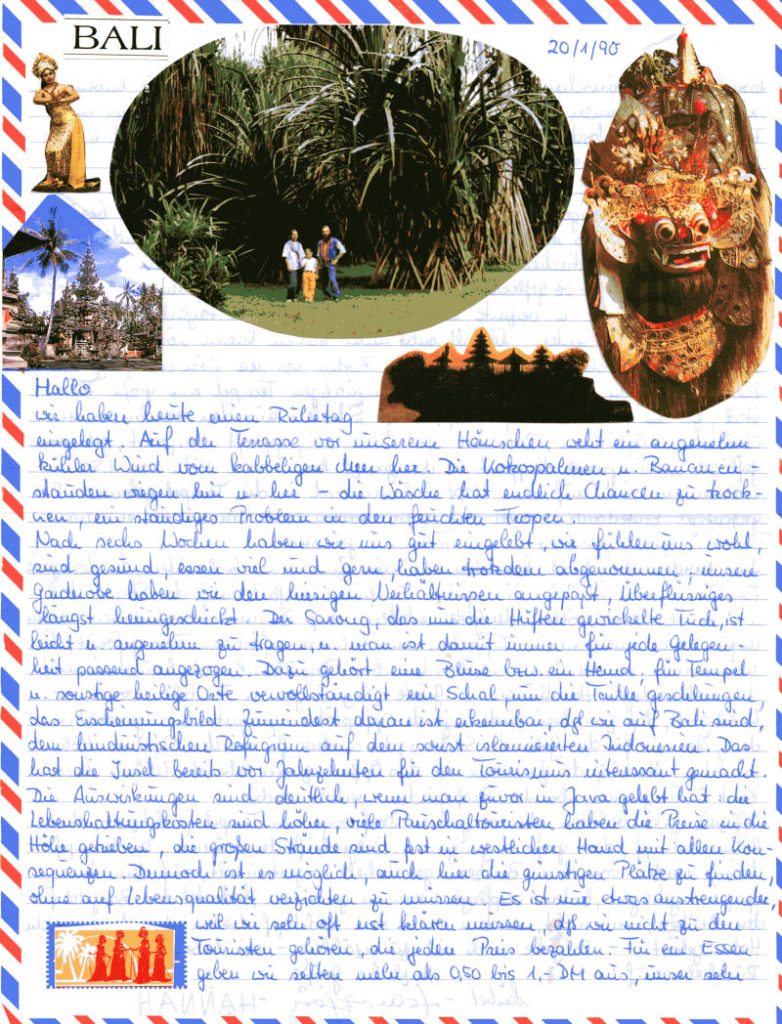 Wir landen also derart vorbereitet am 11.12.1989 zunächst in Kuala Lumpur (Malaysia) und danach in Jakarta. Nach einigen Problemen mit den Visa und dem Gepäck gehen wir auf die Suche nach einem Losmen (einfaches Gästehaus, viel von Backpackern genutzt). Und weil wir schon zu lange keine Dusche hatten und immer noch die schweren Jeans trugen, nahmen wir das erste passende – das Hostel JUSRAN. Eine Nacht zu dritt 8 DM.