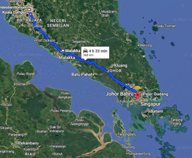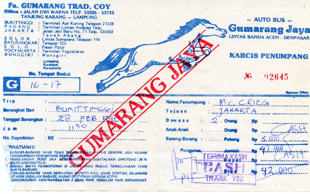 Vom 10.12.1989 bis zum 06.03.1990 verbrachte ich 3 Monate eines ganzen Reisejahres mit damaliger Partnerin und 5-jähriger Tochter in Indonesien. Weil das Touristenvisum aber nur 2 Monate gültig ist, mussten wir nach Ablauf dieser zwei Monate raus und wieder einreisen. Die damals günstigste Option war ein Flug von Jakarta nach Kuala Lumpur. Von dort per Bus nach Singapur und per Schnellboot nach Tanjung Pinang. Die Fahrt zurück nach Indonesien machten wir mit einem Boot bis Pekanbaru auf Sumatra.