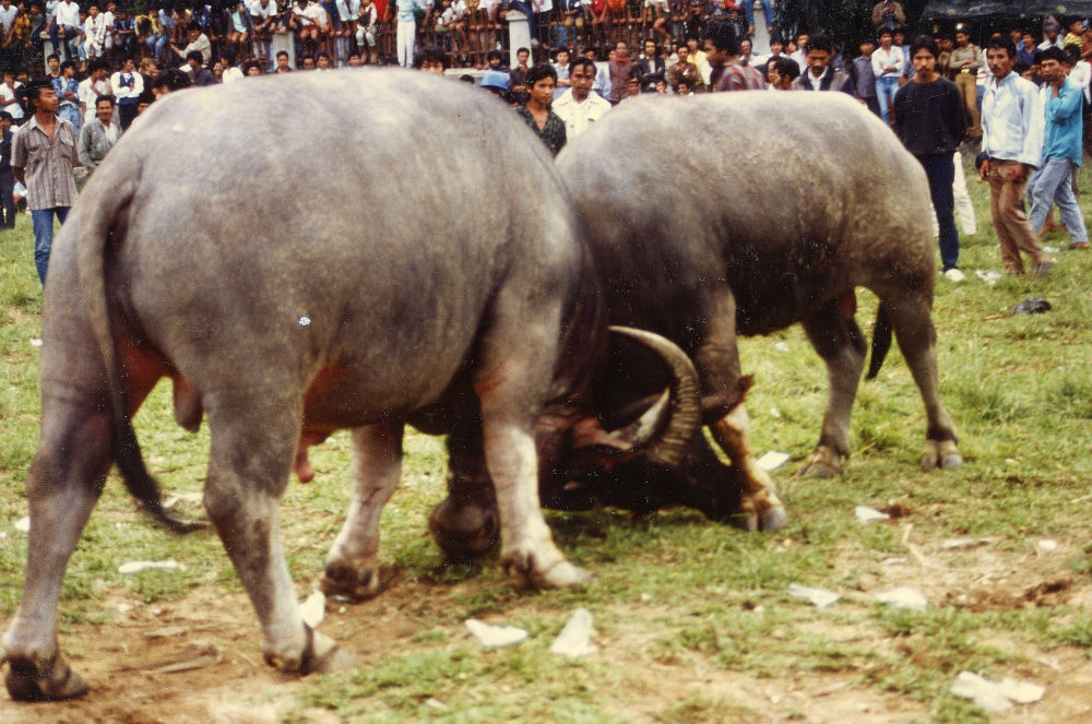 Der erste Kampf zeigt, worauf es ankommt. Die Büffel wollen sich nicht mit den Hörnern verletzen. Sie knallen die Schädel aneinander, Gesichter auf dem Boden, Schnauzen am Boden zurück. Es geht darum, den anderen vom Platz zu drücken. Das ist oft sehr statisch und mit wenig Bewegung. Aber die eingesetzte Kraft gibt die Illusion, dass der Boden bebt. Manchmal stürmt der unterlegene Stier vom Platz. Dann kann es gefährlich werden. Es ist schon passiert, dass dabei ein Mensch getötet wurde. Das unterscheidet den Bullenkampf auf Sumatra vom Stierkampf in Spanien.