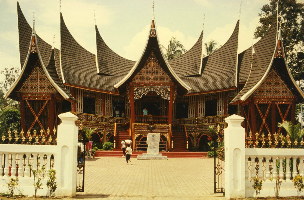 Wir haben mit ingesamt 20 Personen (in zwei Bemos) die geführte MINANGKABAU-Tour gebucht. Wir fahren über Baso und Tabek Patah. Wir lernen Pflanzen kennen: Lemon Gras, Kakaosträucher, Zimtsträucher (mit grünen und nach oben roten Blättern), Pomelo-Baum, Susak. Wir wandern durch ein Dorf mit Kaffeemühlen, die mit Wasserkraft betrieben werden. Dann kommen wir ins Zentrum der Minangkabau-Kultur: Batu Sangkar. Versammlungshäuser, Prunkhäuser, normale Wohnhäuser – alle in traditioneller Holzbautechnik. Typisch sind die an den Giebeln spitz hochgezogenen Dächer, an die Hörner von Stieren erinnernd. Die Kultur basiert auf dem Prinzip der matrilinearen Erbfolge, was bedeutet, dass Haus und Grundbesitz den Frauen gehört. Ein Junge muss, sobald er geschlechtsreif wird, in einem separaten Männerhaus wohnen und hat erst wieder das Recht, in einem Familien-Haus zu wohnen, wenn er heiratet.